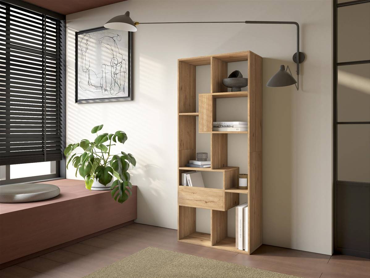 Estantería librería multiposición de diseño, ideal para cualquier estancia de tu hogar. Montaje en horizontal o vertical. Estructura de color roble con veteado de madera de tacto poroso de alta calidad. Medidas: 162x67x31 cm. Estantes interiores de color roble con veteado de madera de tacto poroso de alta calidad. |