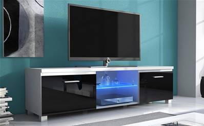 Un fantástico televisor moderno en blanco mate y lacado en negro brillante. Dispone de un estante de cristal con iluminación LED incorporada en el mueble. Las luces LED están en el vidrio, que puede ser utilizado como separador entre los espacios de la tienda. Las luces LED pueden abrirse y cerrarse mediante un botón situado en el suelo que se activa con el pie. Muebles de fácil montaje que se entregan con el manual de instrucciones y las herramientas correspondientes para un montaje óptimo. |