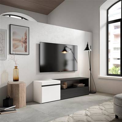 Módulo Tv con puerta, gran capacidad de almacenaje. Medidas del Módulo: 51cm. de Ancho, 45cm. de Alto, 35cm. de Profundidad. Color blanco sólido mate y negro con veteado de madera de tacto poroso de alta calidad.