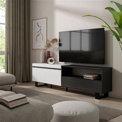 Módulo Tv con puerta, gran capacidad de almacenaje. Medidas del Módulo: 51cm. de Ancho, 45cm. de Alto, 35cm. de Profundidad. Color blanco sólido mate y negro con veteado de madera de tacto poroso de alta calidad.