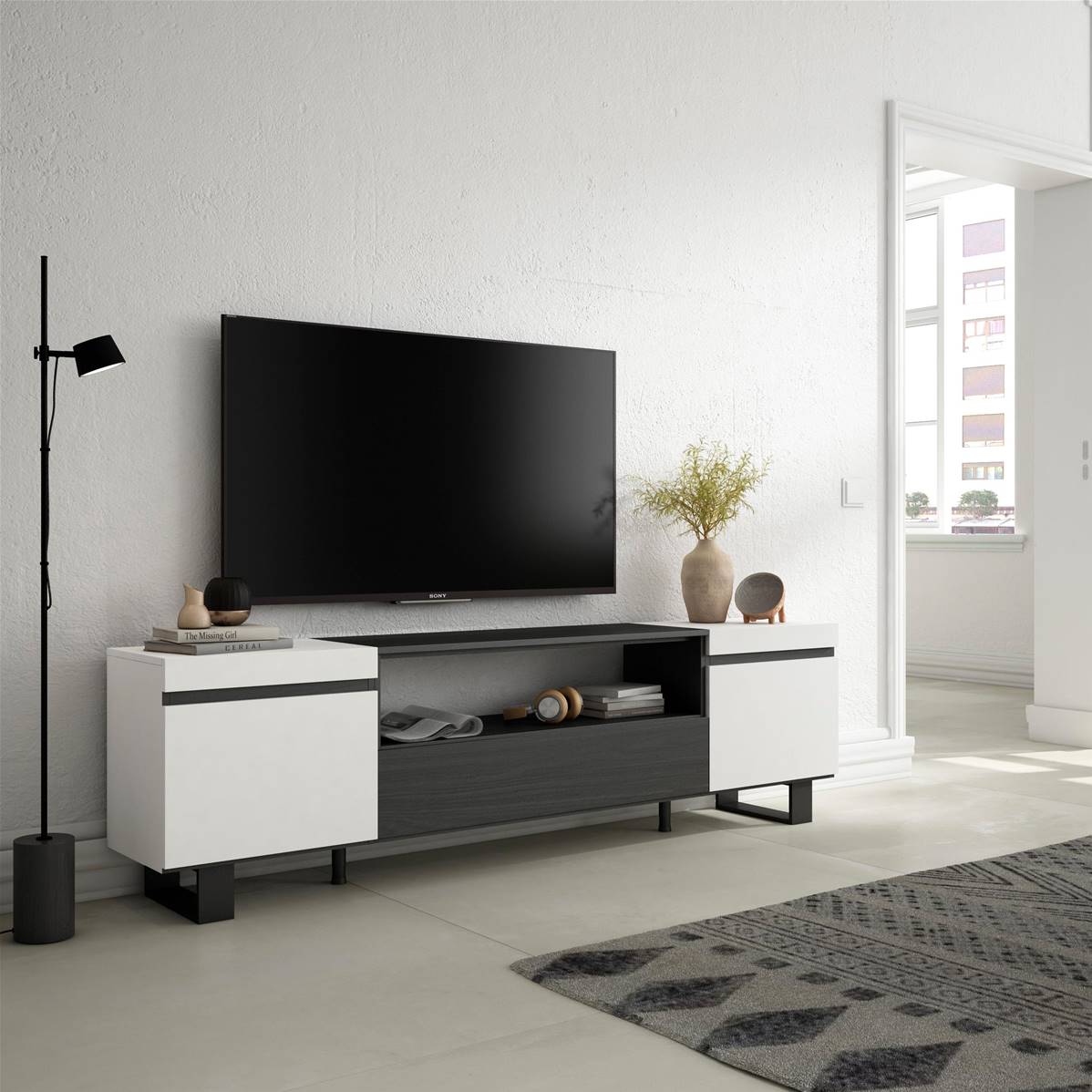 Patas de madera de estilo Industrial. Medidas: 12cm. de Alto, 8cm. De Ancho, 33cm. De Profundidad, color Negro. Módulo Tv con hueco para almacenar sus dispositivos electrónicos y puerta abatible. Medidas del Módulo: 102cm. de Ancho, 45cm. de Alto, 35cm. de Profundidad. Color negro con veteado de madera de tacto poroso de alta calidad. Módulo Tv con puerta, gran capacidad de almacenaje. Medidas del Módulo: 51cm. de Ancho, 45cm. de Alto, 35cm. de Profundidad. Color blanco sólido mate y negro con veteado de madera de tacto poroso de alta calidad. |