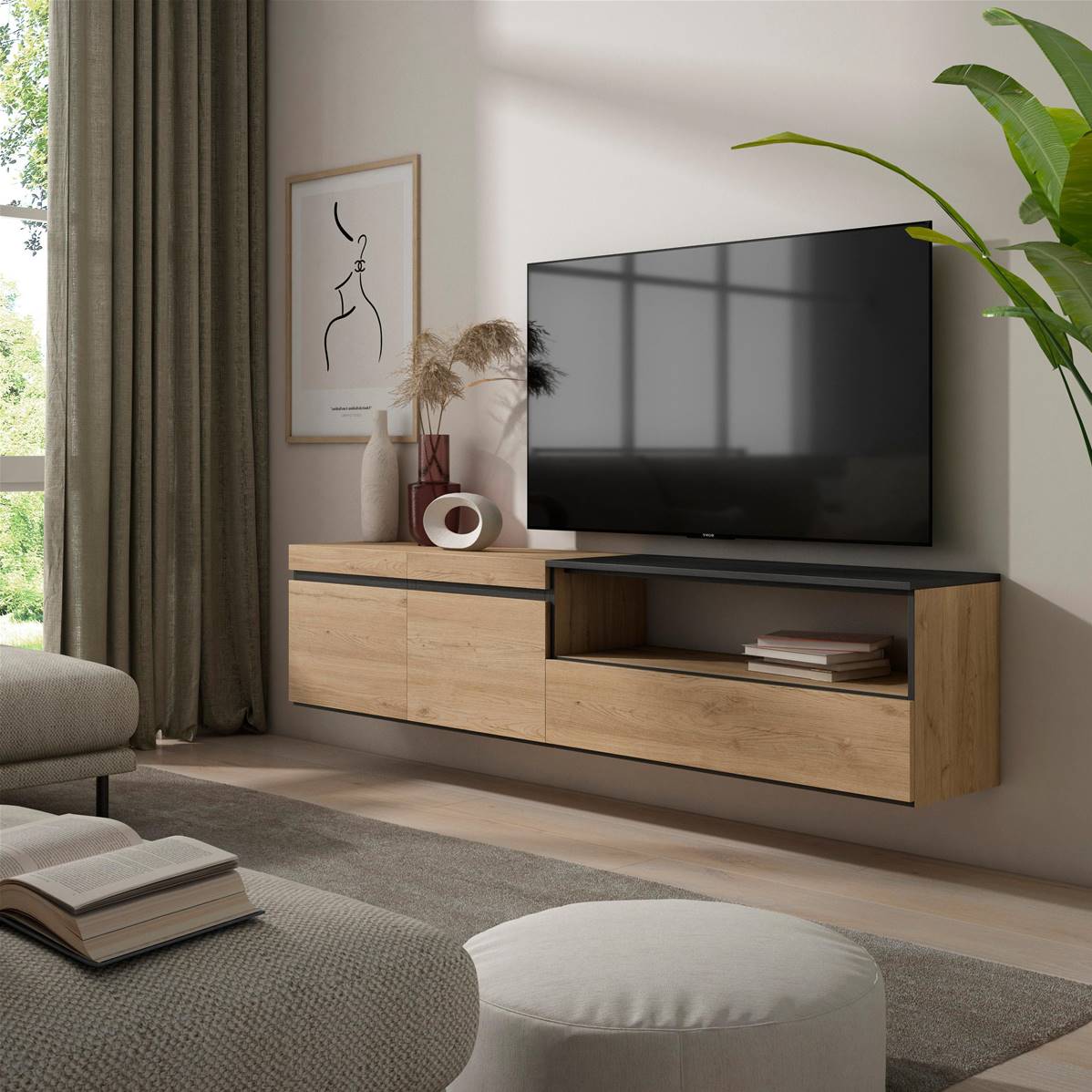 Mueble TV, Televisión, Roble y negro, Colgado, Suspendido