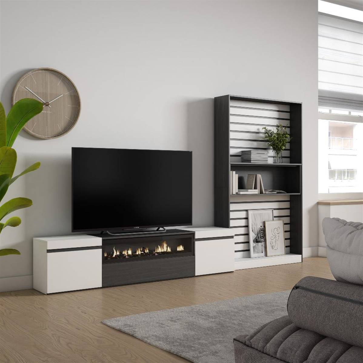 Chimenea Eléctrica LED. Medidas: 102cm. de Ancho, 21cm. de Alto. Efecto de fuego 3D increíblemente realista. Sin riesgos de quemaduras, ya que no incorpora ninguna fuente de calor. Potencia: 34w. Inlcuye mando a distancia y 3 niveles de intensidad. Módulo Tv con hueco para almacenar sus dispositivos electrónicos y puerta abatible. Medidas del Módulo: 102cm. de Ancho, 45cm. de Alto, 35cm. de Profundidad. Color negro con veteado de madera de tacto poroso de alta calidad. Módulo Tv con puerta, gran capacidad de almacenaje. Medidas del Módulo: 51cm. de Ancho, 45cm. de Alto, 35cm. de Profundidad. Color blanco sólido mate y negro con veteado de madera de tacto poroso de alta calidad. Estantería decorativa. Medidas: 110cm. de Ancho, 186cm. de Alto, 25cm. de Profundidad. Color blanco sólido mate y negro con veteado de madera de tacto poroso de alta calidad. Paneles de listones de madera, panel pared 3D. Contiene dos paneles de 107x70 cm. |