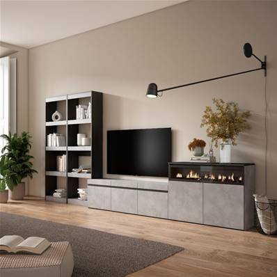 Chimenea Eléctrica LED. Medidas: 102cm. de Ancho, 21cm. de Alto. Efecto de fuego 3D increíblemente realista. Sin riesgos de quemaduras, ya que no incorpora ninguna fuente de calor. Potencia: 34w. Inlcuye mando a distancia y 3 niveles de intensidad. Módulo Tv con puerta, gran capacidad de almacenaje. Medidas del Módulo: 51cm. de Ancho, 45cm. de Alto, 35cm. de Profundidad. Color cemento mate y negro con veteado de madera de tacto poroso de alta calidad. Módulo central de aparador con 2 puertas, gran capacidad de almacenamiento. Medidas del Módulo: 102cm. de Ancho, 75cm. de Alto, 35cm. de Profundidad. Color cemento y negro con veteado de madera de tacto poroso de alta calidad. Estantería compuesta de 4 estantes, gran capacidad de almacenamiento, estilo moderno con zócalo. Medidas: 60cm. de Ancho, 186cm. de Alto, 25cm. de Profundidad. Color cemento y negro con veteado de madera de tacto poroso de alta calidad. Materiales duraderos: Fabricada con robusto tablero de calidad, acabados de alta gama y elegante tacto de madera porosa. Esta estantería de almacenamiento albergará tus valiosos objetos de colección. |